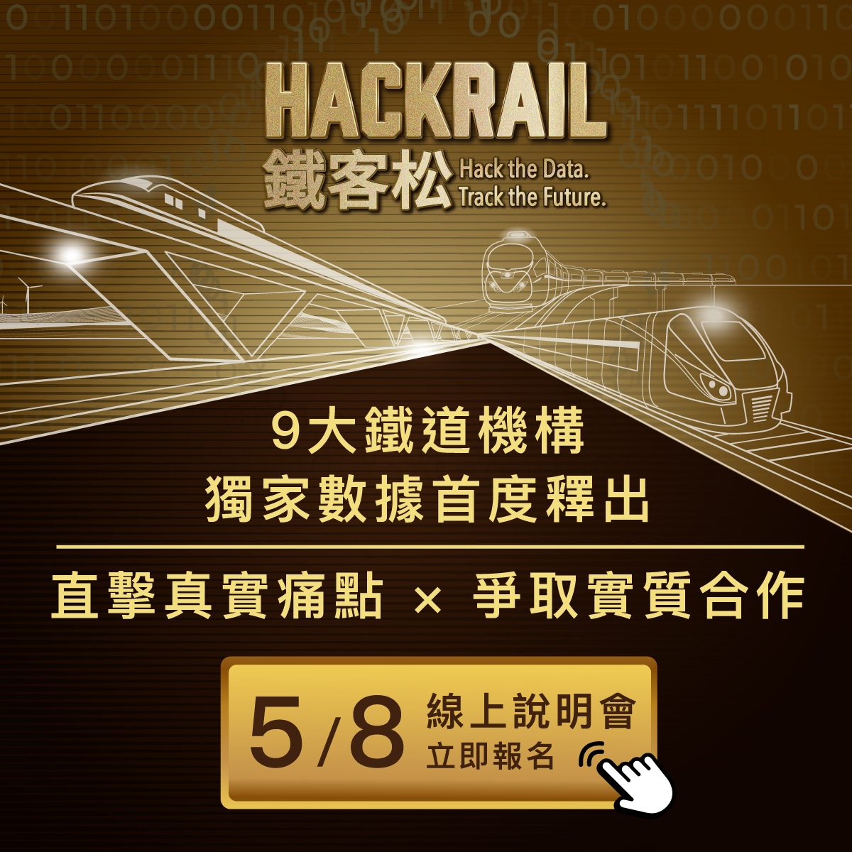 每天的通勤、每次的轉乘,其實都有機會反思「鐵道是否夠聰明」? 鐵道早已不僅是單純的「交通工具」,更透過場站開發提升周邊區域生活機能,深深串起民眾生活! 為了精進鐵道服務,交通部鐵道局聯合台鐵、高鐵及北捷等9家鐵路營運機構,規劃「HackRail鐵客松」競賽,邀請您運用鐵道收據,打造新美好生活!